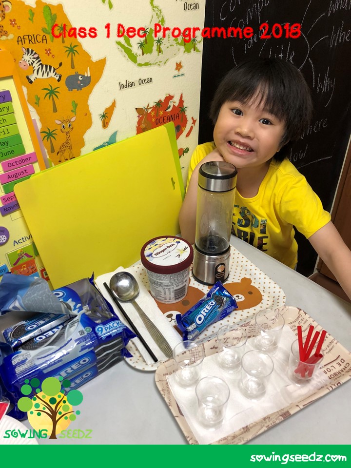 Class 1 – English & Math Dec Prog Oreo Milkshake! What can go wrong with this combination? Our poster boy’s wide and anticipating smile says it all. He even helped prepare the materials and ingredients. Seems well trained by our founder. The class cheered when they knew about the lesson’s craft activity for today,… Continue reading Class 1 / 11 Dec 2018 Tuesday / Oreo Milkshake